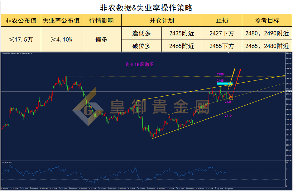 综上,美国通胀已经逼近美联储2%目标,首次降息已经锁定9月,与此同时,就业市场正在不断降温,甚至即将触发衰退信号,而美联储更不排除随着经济衰退的演化而在年内增加降息次数。在接下来几个月,黄金也将围绕经济衰退乃至经济危机到来的可能性进行炒作。本次非农就业人口预测值17.5万属于近期偏低水平,且低于前值20.6万,有潜在利多金价效应,若公布值低迷,将继续助推金价。但如公布值高于前值甚至意外高于21万人,将对近日金价多头情绪形成打压,金价有望重新回测2400整数关口。此外,失业率近期已经成为市场判断经济衰退与否的关键指标,需要重点留意本次失业率是否进一步上行,并高于前值4.1%。具体留意晚间数据公布。
